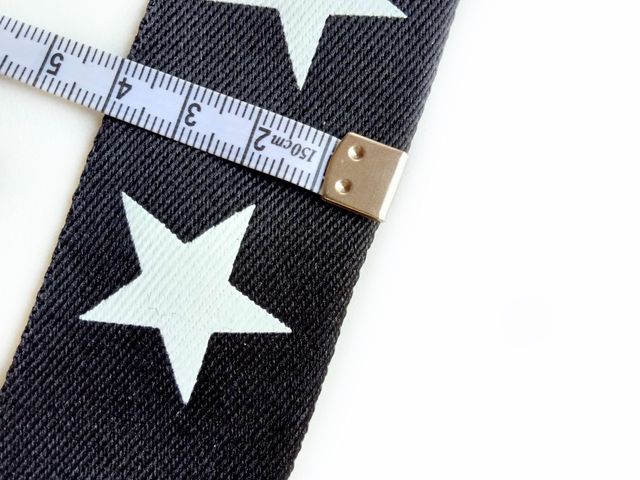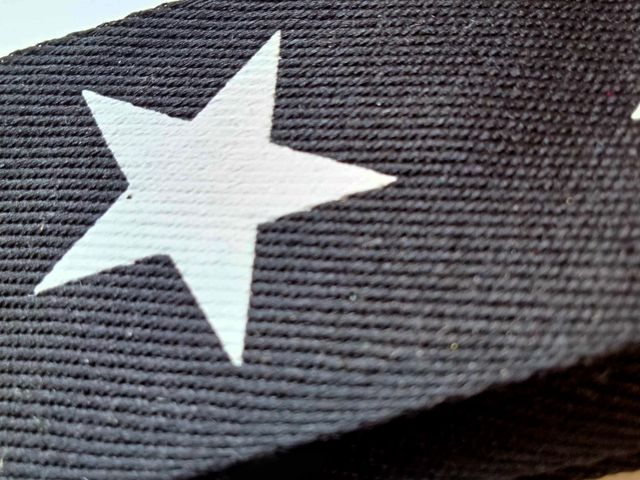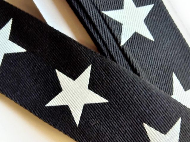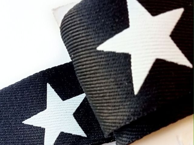 Nuovi arrivi moda, passamaneria nera con stampa stella bianca, altezza 4 cm, poliestere, materiale per creare, abbellire, personalizzare capi di abbigliamento, accessori, arredamento. Made in Italy