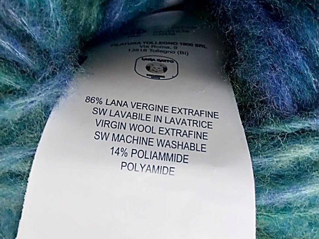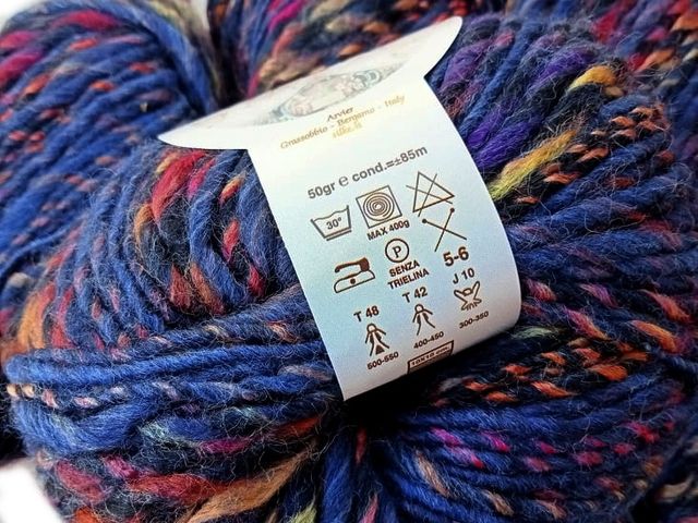 Bellissimo filato Lana Gatto moda 2025, disponibile nel colore blu fantasia, composizione tessile : 63% lana, 24% cotone, 10% poliammide, peso gomitolo 100gr. lunghezza filato 230 mt. Made in Italy