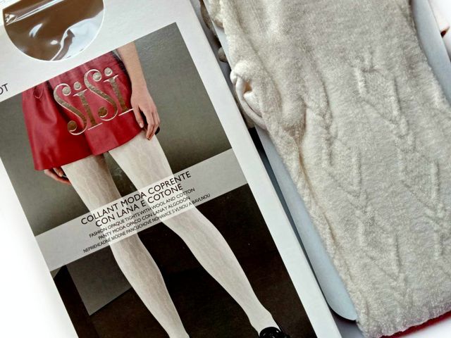 Collant SiSì coprente con trecce geometriche in rilievo, moda 2025, disponibile nella taglia 2/3 e nel colore panna e nero, composizione tessile 47% poliammide, 29% cotone, 22% lana, 2% elastan.