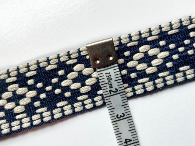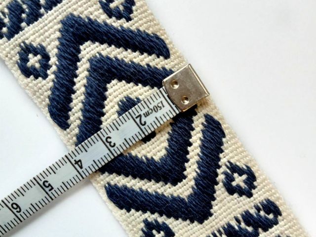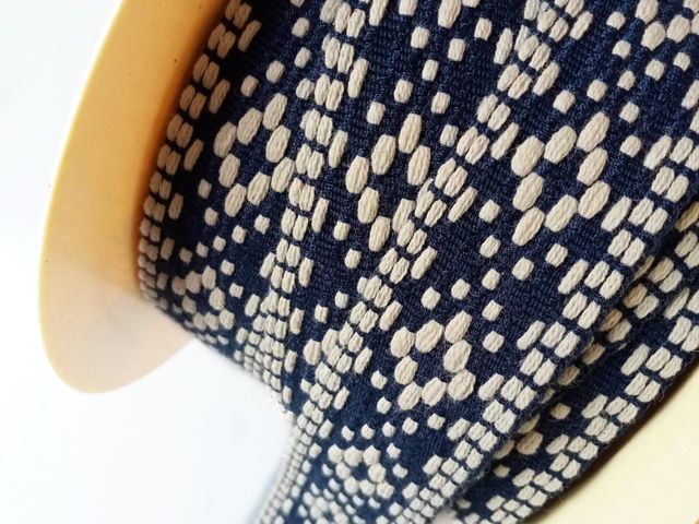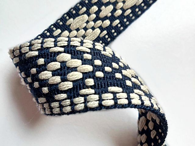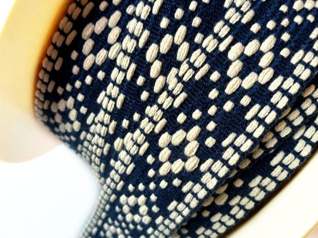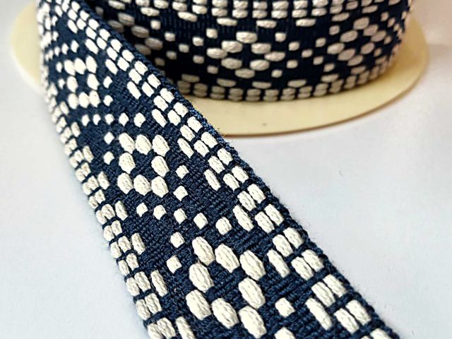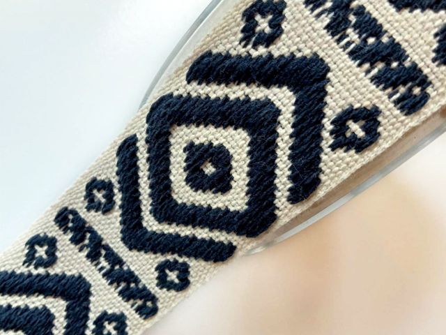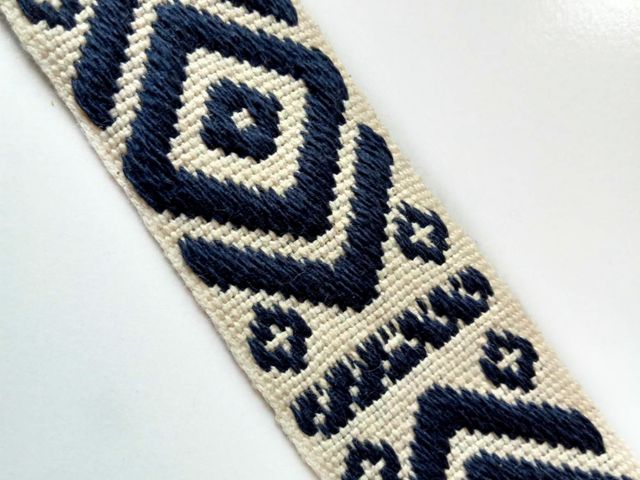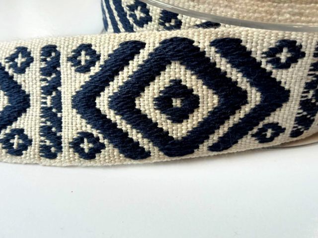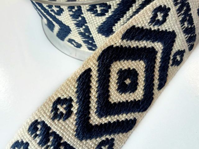 Passamaneria etnica base blu disegni avorio, altezza 25 mm. Poliestere-cotone. Ideale per arredamento, hobby, abbigliamento. Made in Italy