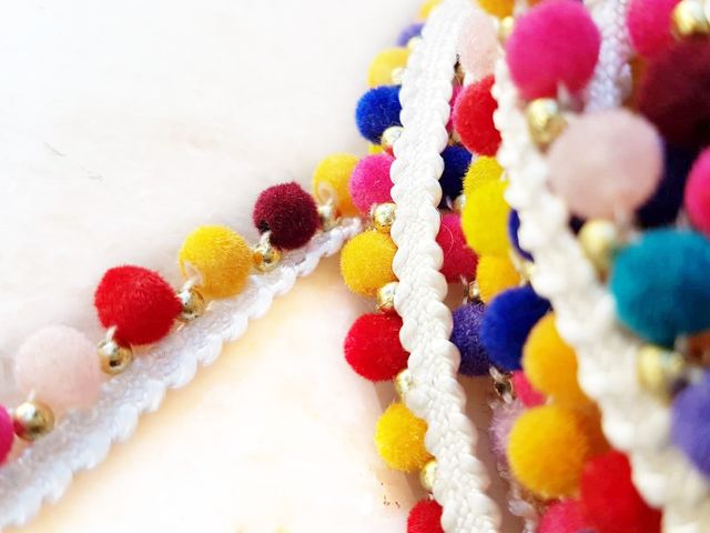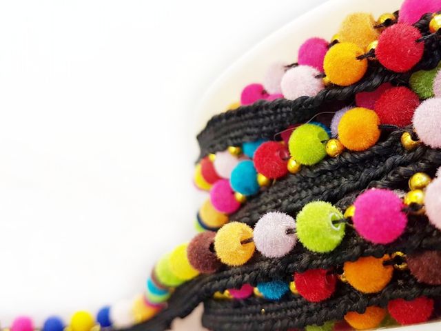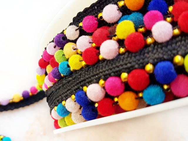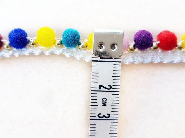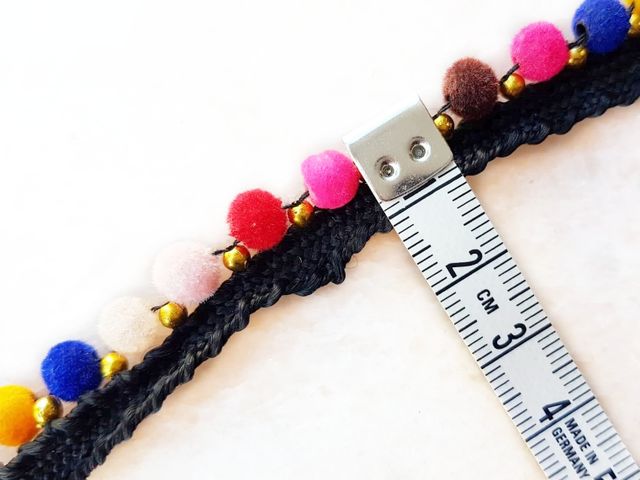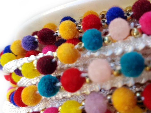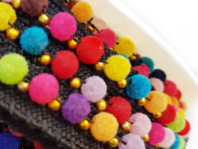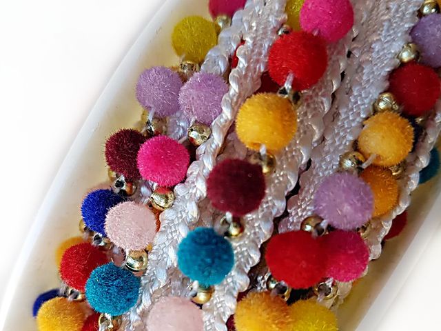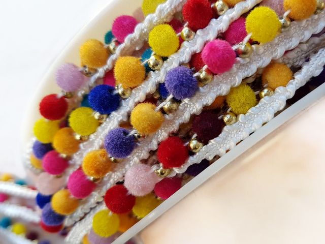Bellissima passamaneria pom-pom multicolor moda 2025, altezza 1 cm, poliestere. Ideale per hobby, abbigliamento, arredamento. Made in Italy.