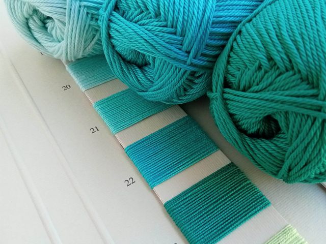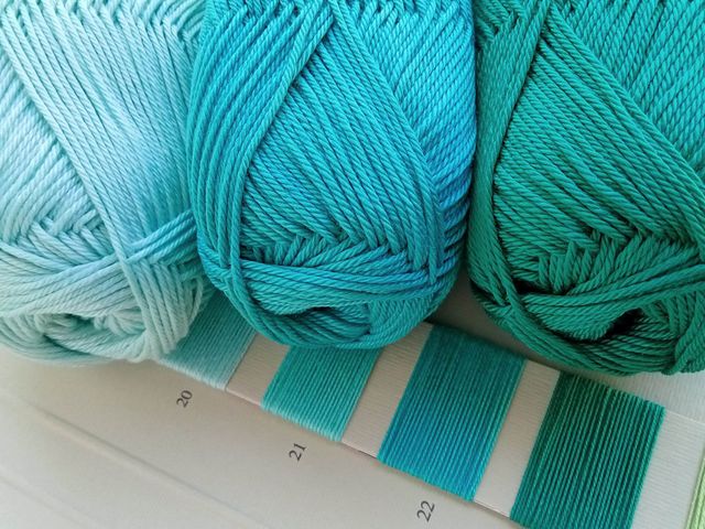 Bellissimo filato in cotone assortito in tre toni di colore acquamarina composizione tessile 100% cotone, peso gomitolo 50 gr. lunghezza mt.125, uncietto consigliato n° 2 - 2,5. Materiale per creare.
