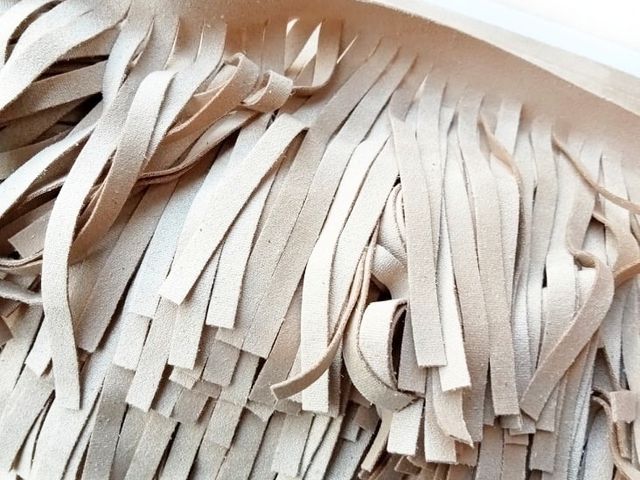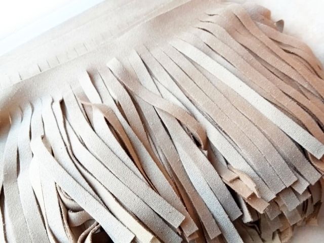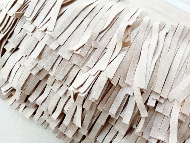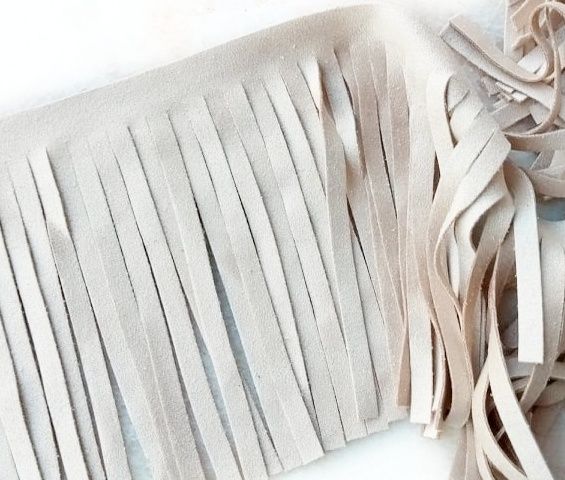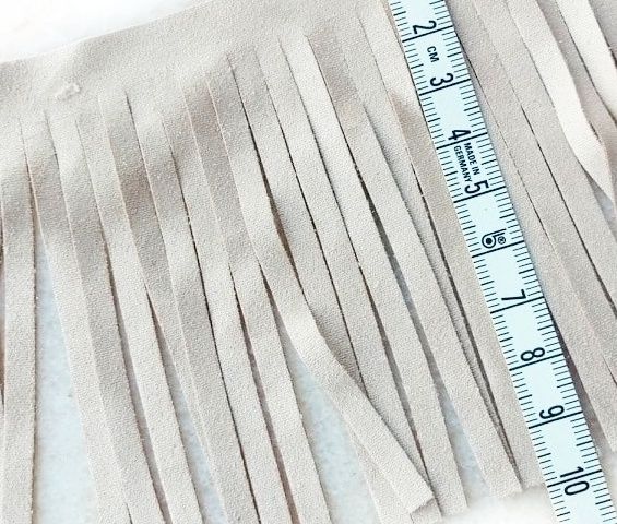 Frangia in microfibra colore sabbia, altezza circa 10 cm. Materiale per creare, abbellire, personalizzare capi di abbigliamento, accessori.