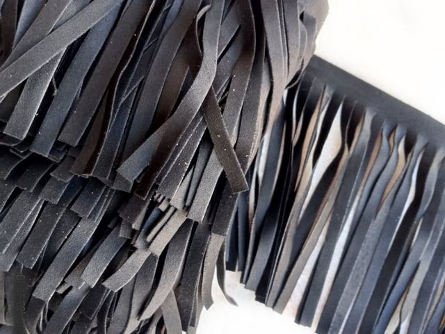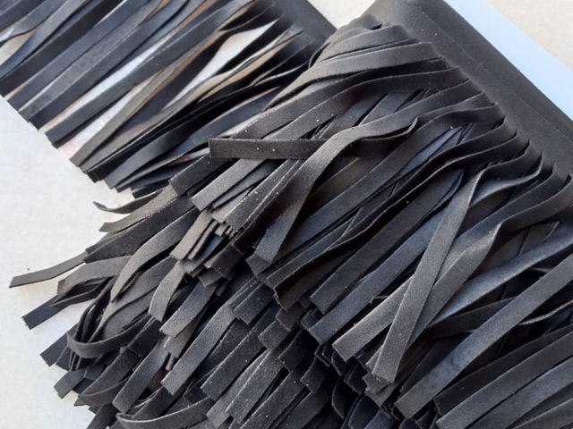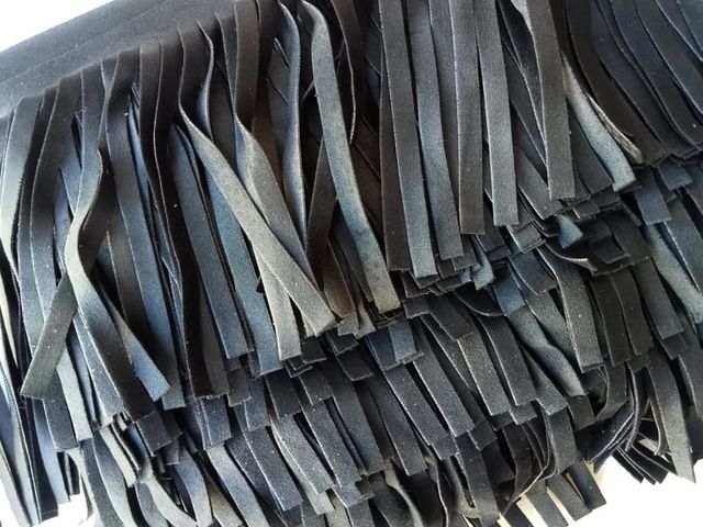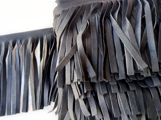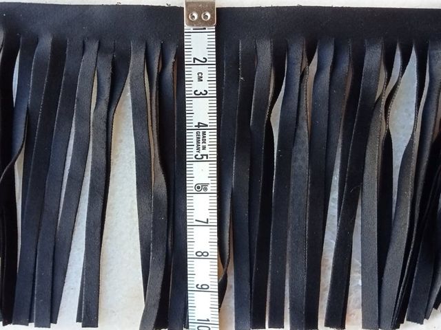 Frangia simil-camoscio, disponibile nel colore nero, composizione tessile microfibra, altezza 10 cm. Made in Italy