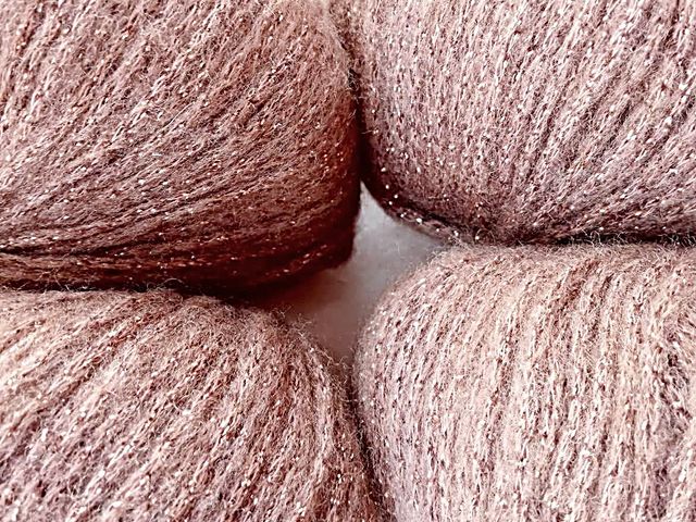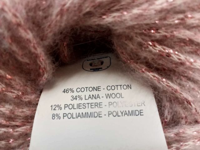 Offerta sconto; ultimi gomitoli filato Lana Gatto, disponibile nel rosa antico-lurex, composizione tessile; 46% cotone, 34% lana, 12% poliestere, 8% poliammide, peso gomitolo 50 gr lunghezza 120 m n 5