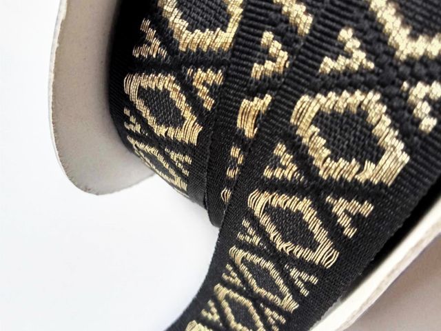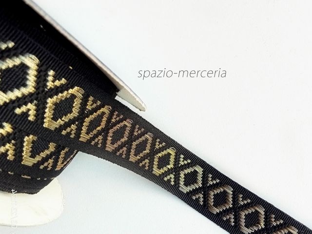 Passamaneria nera con rombi oro antico, altezza 20 mm, poliestere. Made in Italy. Ideale per abbigliamento, arredamento, hobby.