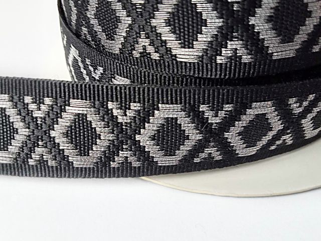 Passamaneria nera con rombi argento antico, altezza 20 mm, poliestere. Made in Italy. Ideale per abbigliamento, arredamento, hobby.