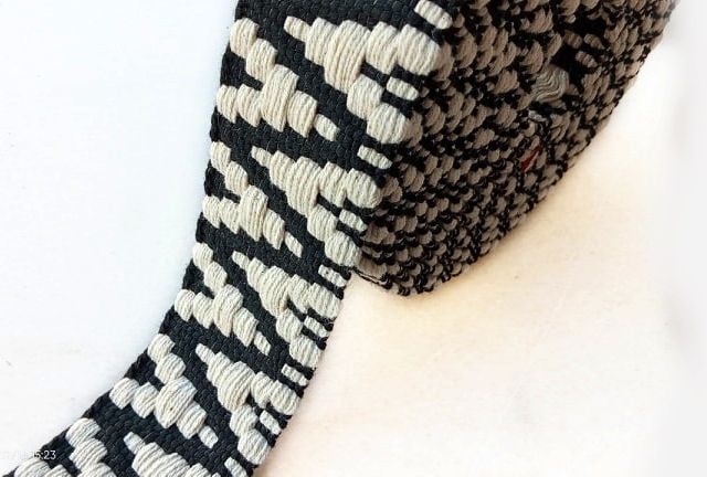 Bellissima passamaneria stile etnico, disponibile nel colore avorio-nero, altezza circa 4 cm, poliestere. Made in Italy. Ideale per abbigliamento, arredamento, hobby.